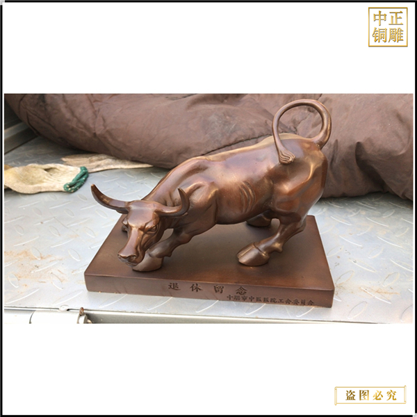 中正銅雕-華爾街銅牛雕塑擺件 華爾街銅牛雕塑擺件工藝品 小型華爾街銅牛雕塑擺件,我公司集科研、開(kāi)發(fā)設(shè)計(jì)、普通鑄造、一次性整體澆鑄、精密鑄造于一體。本公司技術(shù)力量雄厚,設(shè)備,不但重視中國(guó)青銅器原有的藝術(shù)風(fēng)格,還繼承了文物原有的藝術(shù)品味,在繼承和發(fā)揚(yáng)古老文化的同時(shí),更深一步為新老客戶(hù)定身量制各種銅制、鐵制工藝品等產(chǎn)品。