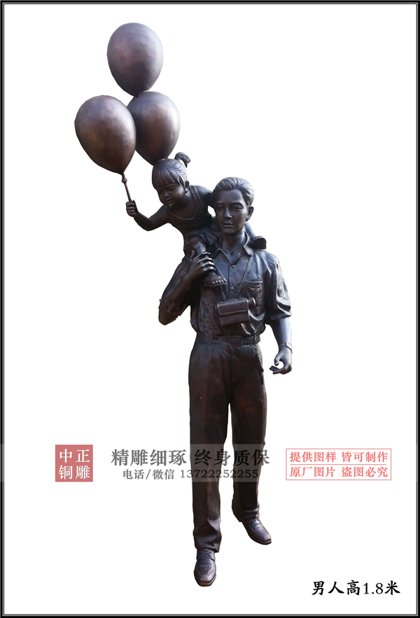 一家三口人物雕塑的創(chuàng)作來源生活,是小品雕塑的一種類型,造型中可愛的孩子手握氣球騎在爸爸肩頭,滿臉洋溢著幸福之感,母親在一旁,觀望著孩子,給人一種溫馨又似成相識(shí)的感覺,這樣的畫面在現(xiàn)實(shí)生活中隨處可見,以鑄鐵雕塑的形式呈現(xiàn)則更加形象化,更具有現(xiàn)實(shí)意義,讓人們?cè)诖颐χ薪蛔⊥O履_步來欣賞下這溫馨的畫面。同類型的鑄鐵雕塑產(chǎn)品還有涮火鍋雕塑、洗腳雕塑等,都是現(xiàn)代雕塑系列中親情與愛的表現(xiàn)形式。