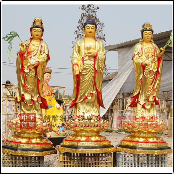 在西方三圣的塑像或者畫像中,中間是阿彌陀佛,佛的左邊是觀世音菩薩,右邊是大勢至菩薩。佛的形像一般是結(jié)手印,或者手捧一個蓮盞,代表阿彌陀佛接引眾生的心;觀世音菩薩手里拿一個楊枝凈瓶:瓶中甘露常遍灑,手內(nèi)楊枝不計秋;大勢至菩薩則是手執(zhí)長柄的蓮花,代表智慧的大勢遍至十方。中正銅雕-1.6米高西方三圣銅像、1.6米高西方三圣銅像價格、1.6米高西方三圣銅像廠家,觀世音菩薩法號“正法明如來”,因悲心廣大,才倒駕慈航,來救無邊眾生。觀世音菩薩在釋迦牟尼佛在娑婆世界教導(dǎo)眾生的時候,又來幫助釋迦牟尼佛行教化眾生。